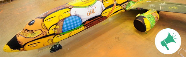 Com a intenção de quebrar o clima sério dos aeroportos, Os Gêmeos transformaram a o hangar em um atelier e fizeram um trabalho sensacional! Quando apresentaram o projeto a Gol, a companhia aceitou e quer aproximar os passageiros da arte.
